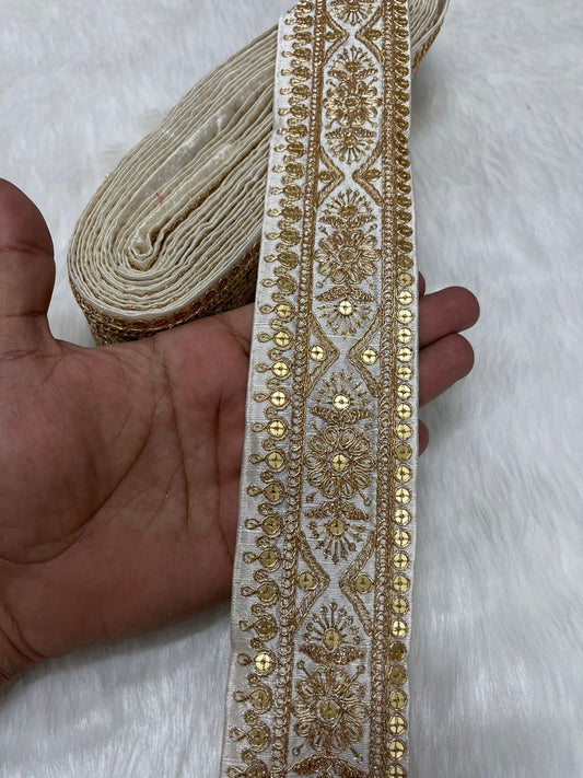 Embroidered Zari Lace ? Indian Wedding Trims, Saree Border, 2 Inch Wide Lace Reel (9 Mtr) | White