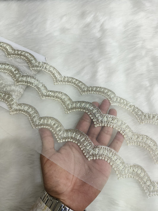 Handcrafted Pearl And Zardozi Lace Borders ? Premium Quality, Intricate Embellishments for Sarees, Lehengas, Bridal Couture, and Luxury Home Decor – Silver