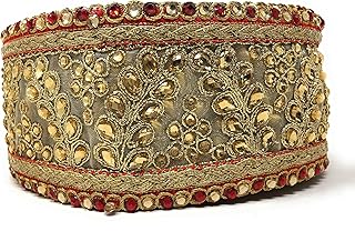 Inhika 9 Meters Laces for Saree Border Gold, Pearl Embroidery, Beaded Stone n Pearl, Velvet Material (8 cm Wide, Red)