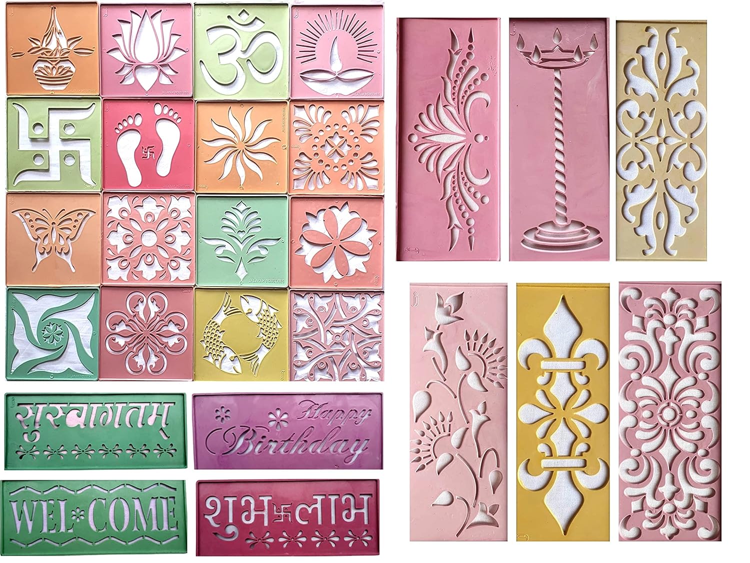 Ready to Draw Rangoli Making Stencils – Plastic Stencils for Floor Decoration (4×4 inches – Set of 16) and (3×7 inches – Set of 10)